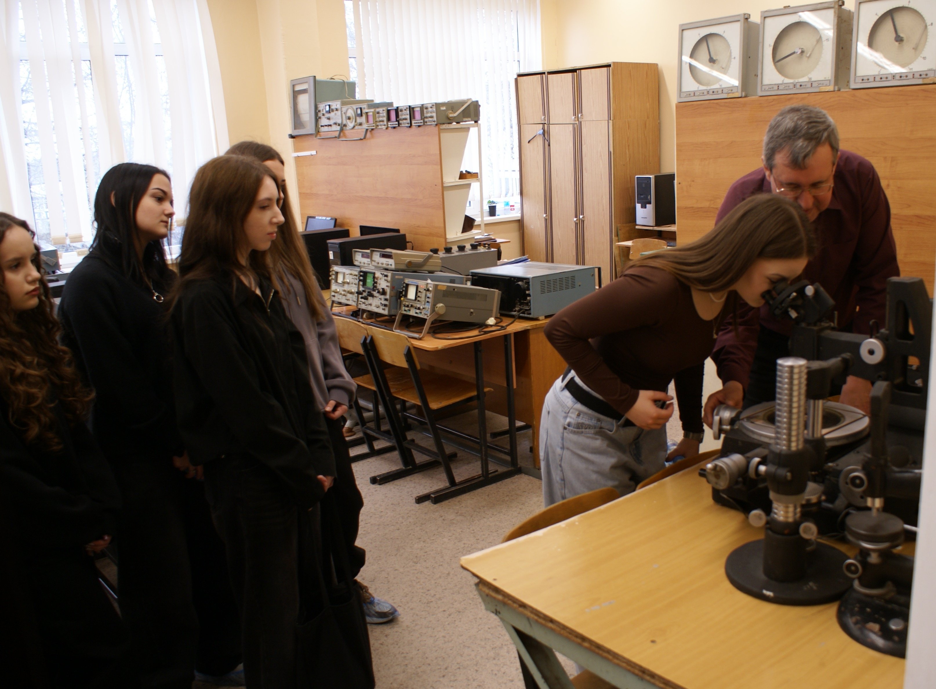 «Большой интерес вызвали высокоточные методы измерения электрического сопротивления с помощью мостовой схемы Уитсона и четырёхпроводной схемы Кельвина, которые необходимы для усиления измерительных сигналов от слаботочных тензорезистивных датчиков силы, массы и давления. Также внимание ребят привлекли оптические приборы для точных измерений размеров деталей машин - большой инструментальный микроскоп и катетометр. Девизом нашей экскурсии и мастер-класса стало «Руками - трогать!» - школьники самостоятельно провели измерения физических величин на всех лабораторных стендах», - отметил Владимир Марков.