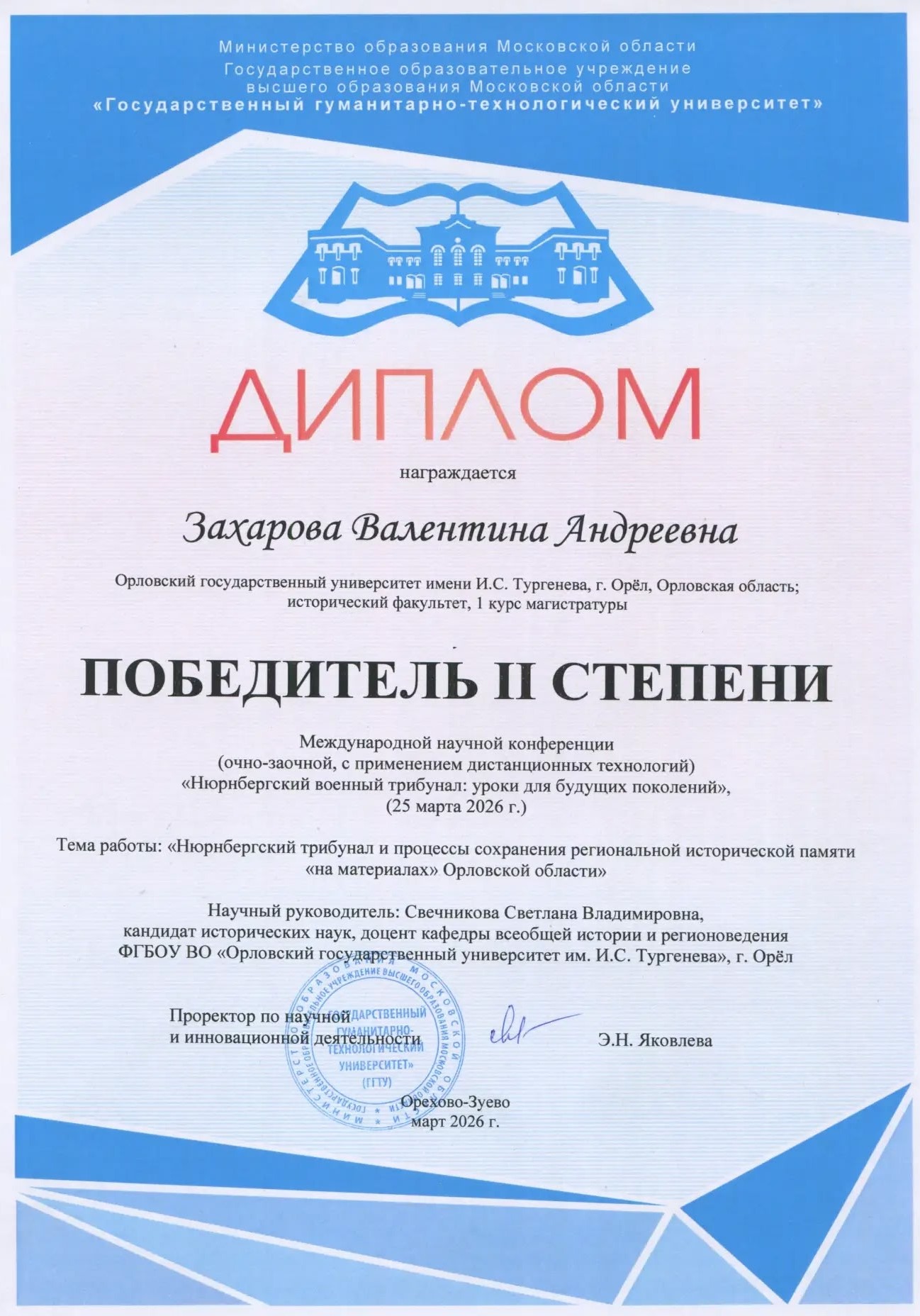 25 марта в городе Орехово-Зуево Московской области прошла международная конференция «Нюрнбергский военный трибунал: уроки для будущих поколений». Студенты Даниил Кузнецов и Валентина Захарова представили совместный доклад, посвященный сложным вопросам установления фактов геноцида народов СССР и методологии изучения этих тем в школьных курсах истории. Работа была высоко оценена экспертами и отмечена дипломом. «Нюрнберг доказал: зло должно быть названо и наказано. Эта конференция позволила увидеть полную картину трибунала и его непреходящее значение», — поделилась впечатлениями Валентина.