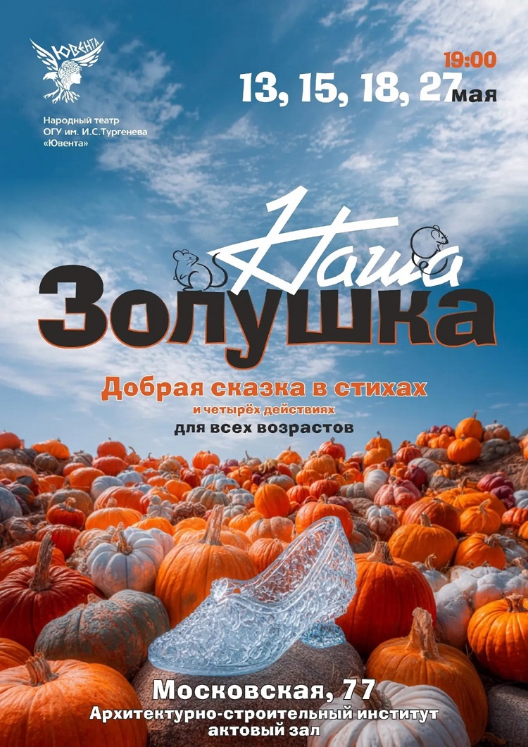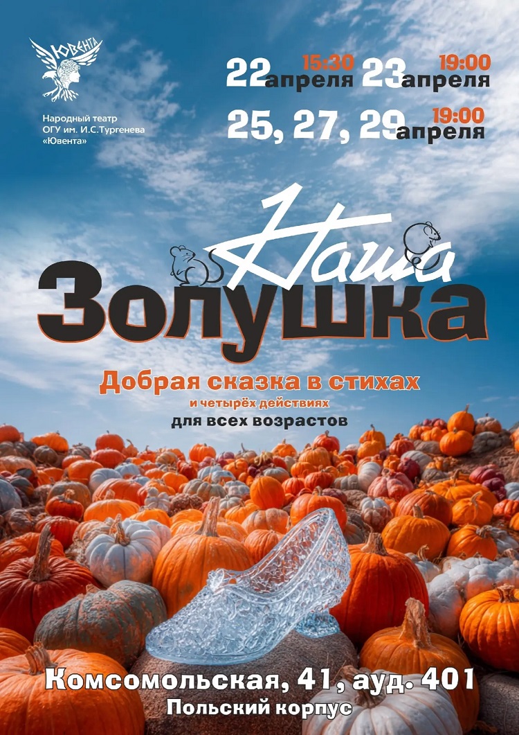 Народный театр «Ювента» ОГУ имени И.С. Тургенева представляет весеннюю премьеру — добрую сказку в стихах «Наша Золушка» по мотивам Шарля Перро.