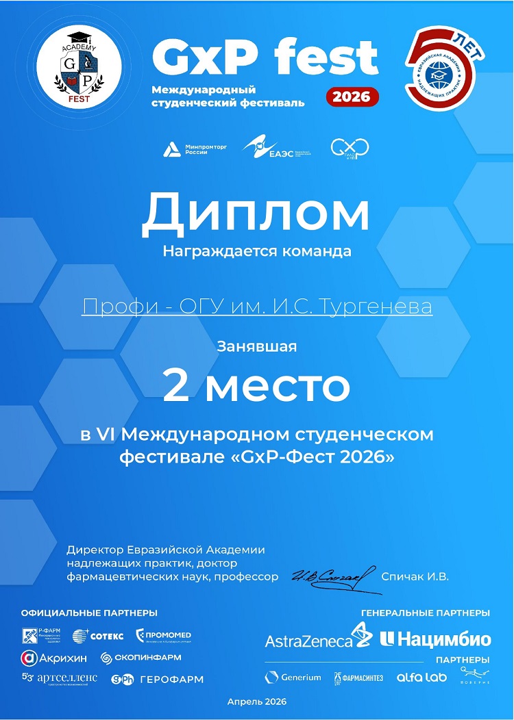 23 апреля завершился заключительный этап VI Международного студенческого фестиваля «GxP-Фест 2026». Мероприятие объединило участников из фармацевтических вузов России, Белоруссии и Казахстана. Орловский государственный университет имени И.С. Тургенева представила команда «ПРОФИ» – студенты Медицинского института специальности «Фармация». В итоге команда заняла почетное второе место, обойдя более 200 коллективов-участников фестиваля.