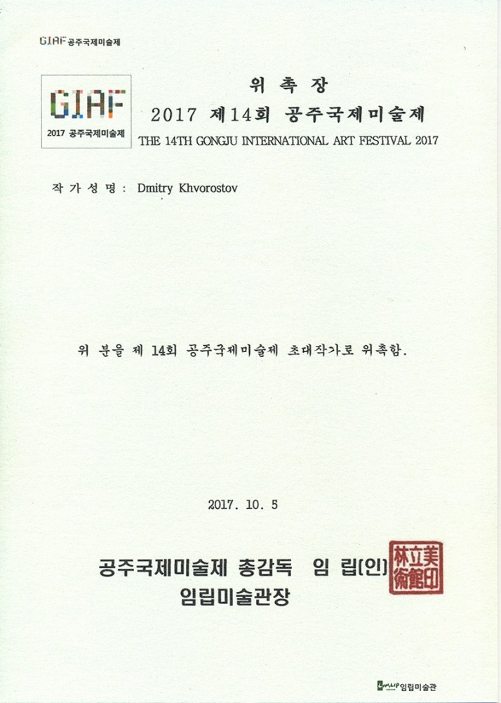 Дмитрий Хворостов был приглашен к участию в выставке известным корейским художником, директором фестиваля мистером Лим Лип и выставил шесть своих картин.