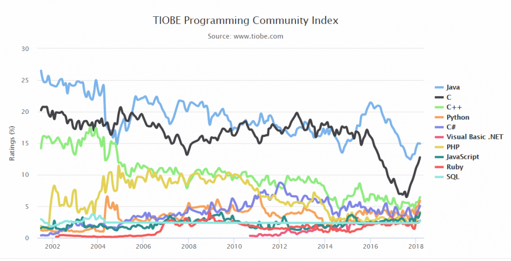 Согласно индексу TIOBE по состоянию на март 2018 года Java является самым популярным языком программирования в мире.