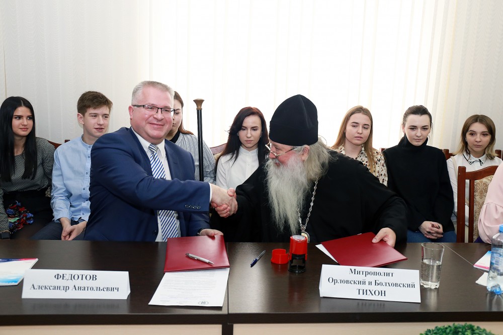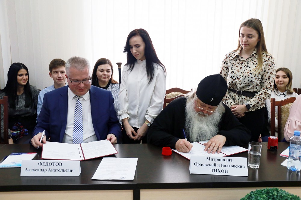 В рамках круглого стола состоялось подписание Договора о сотрудничестве между ОГУ им. И.С. Тургенева и Орловской митрополией.