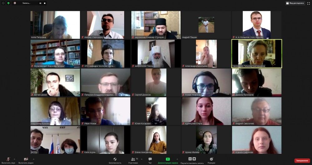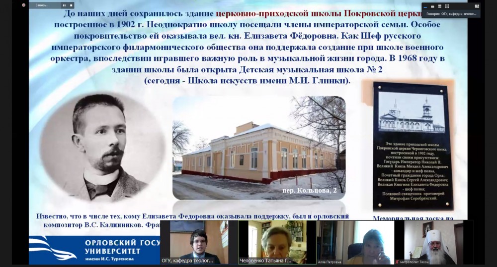 В своём приветственном слове, а затем в докладе ««Утраченные храмы Орловщины: история в лицах, христианство в реликвиях»: учебная практика студентов-теологов в условиях дистанционного обучения» Человенко Т.Г. обратила внимание на необходимость рассматривать церковное зодчество в единстве с жизненным миром человека, когда храм становится и средоточием жизни, и сакральным местом духовного возрастания. В условиях дистанционного обучения примером поиска таких путей формирования духовно-нравственных ценностей личности и теологически ориентированного мировоззрения студентов стал проект «Утраченные храмы Орловщины: история в лицах, христианство в реликвиях». Лучшая презентация «Гарнизонная церковь в честь Покрова Богородицы