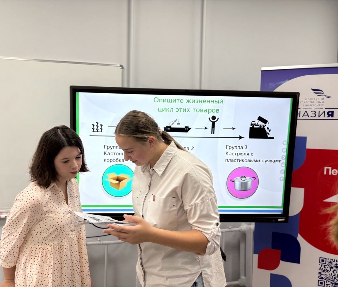 Учащиеся 11 класса, Мария Сёмкина и Олеся Архипина, подробно рассказали гимназистам о значимости проблемы отходов и её воздействии на окружающую среду, представили концепцию «жизненного цикла вещей», акцентировав внимание на её связи с истощением природных ресурсов. Девушки отметили, что на каждом этапе жизненного цикла предмета, начиная с добычи сырья и заканчивая утилизацией, расходуются значительные ресурсы.