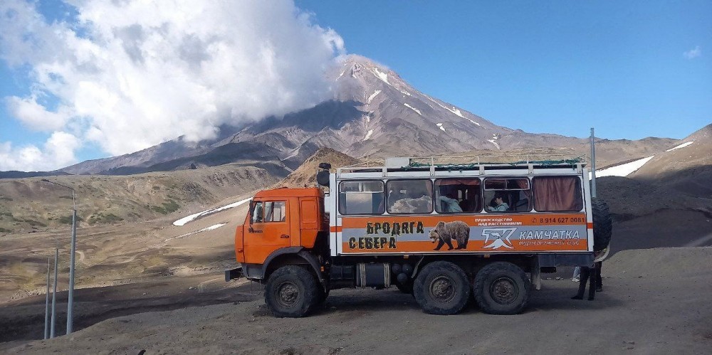 В следующий раз участников повезли на Авачинский перевал между Корякским и Авачинским вулканами. Чтобы добраться туда пришлось преодолеть непростой путь на камазах по Сухой реке. Это территория, которая во время таяния ледников весной становится полноводной рекой, а сейчас здесь труднопроходимая дорога.