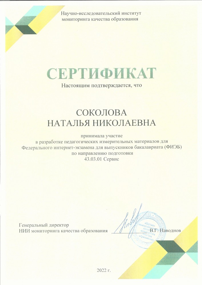 Преподаватели кафедры сервиса принимали участие в создании инновационных педагогических измерительных материалов для федерального проекта по независимой оценке качества образования «Федеральный интернет-экзамен для выпускников бакалавриата (ФИЭБ-2022)» по направлению подготовки 43.03.01 Сервис.