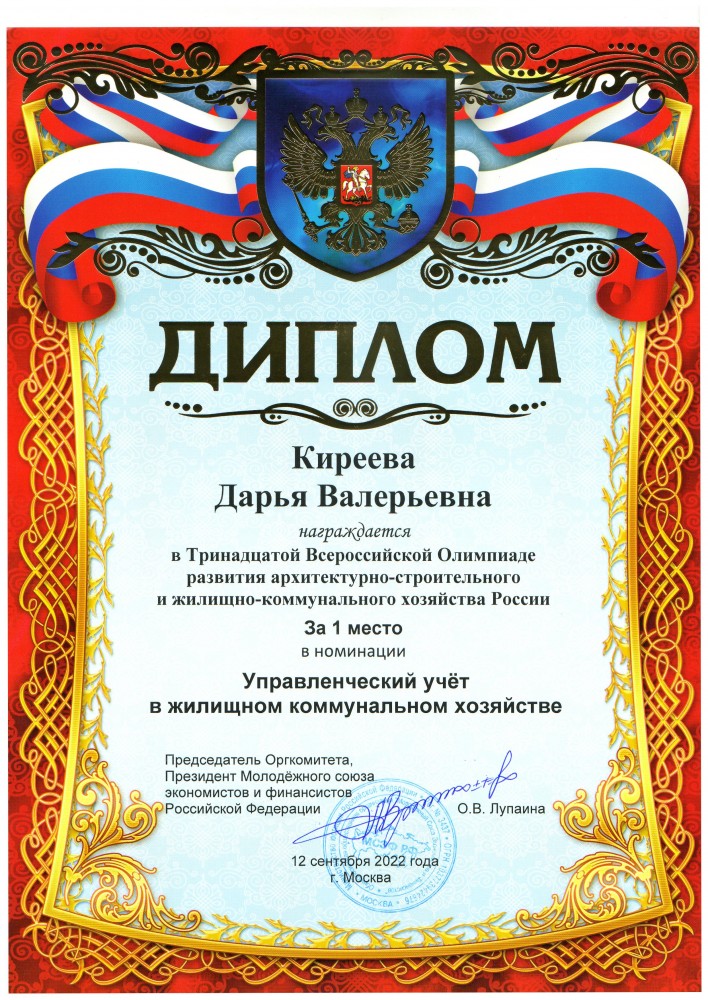 Киреева Дарья Валерьевна - XIII Всероссийская Олимпиада развития архитектурно-строительного и жилищно-коммунального хозяйства России. Номинация 59. Управленческий учёт в жилищном коммунальном хозяйстве.