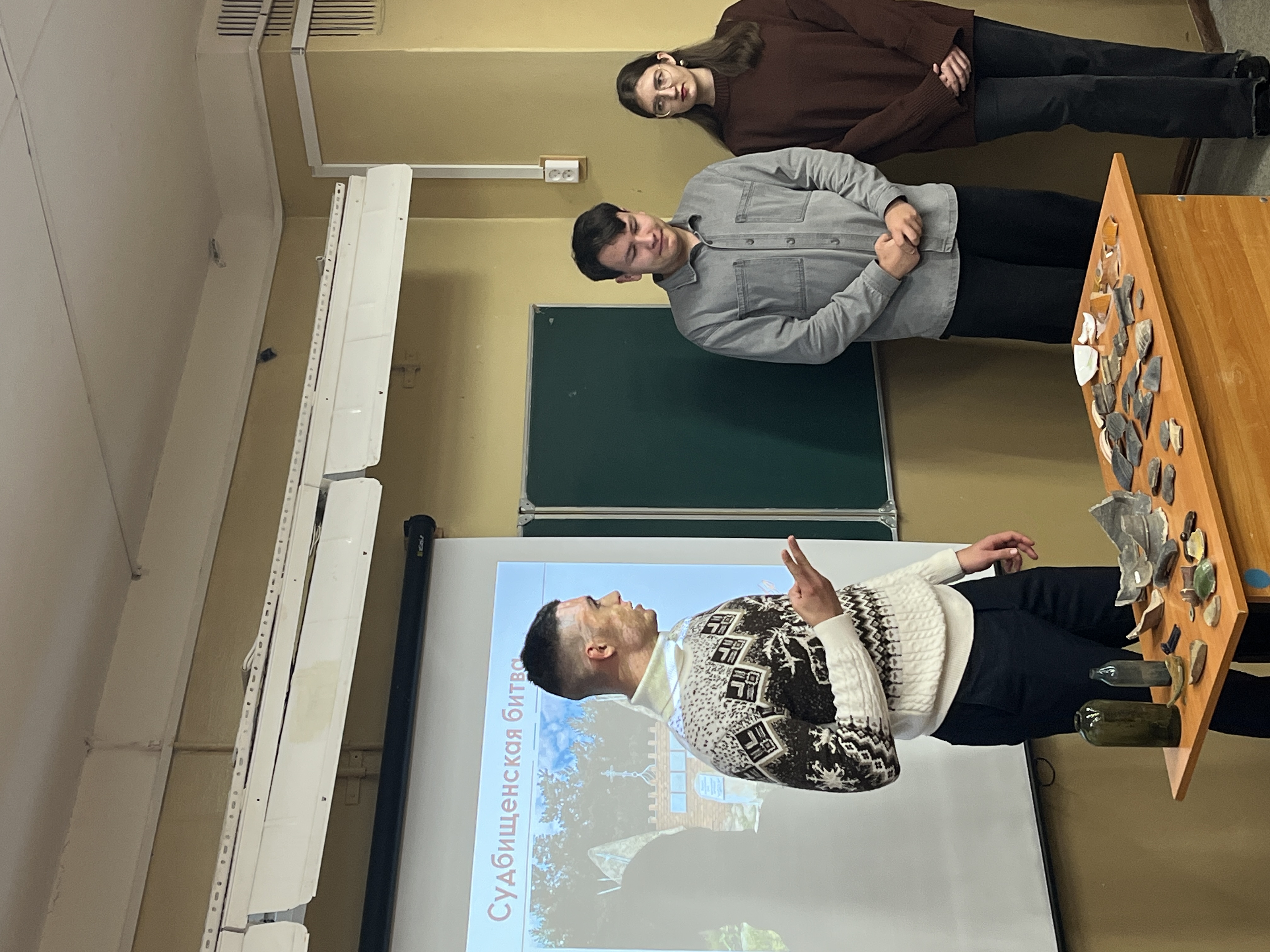 Студенты-волонтеры рассказали о Судбищенской битве, Детинце Орловской Крепости и о экспедиции текущего года, затронули тему проведения археологических раскопок, которые проводились на этих объектах, и рассказали о новых находках. Семиклассники узнали о музеефикации археологического наследия Орловщины, о проектах, которые помогут сохранить историческое и археологическое богатство Орловской области.