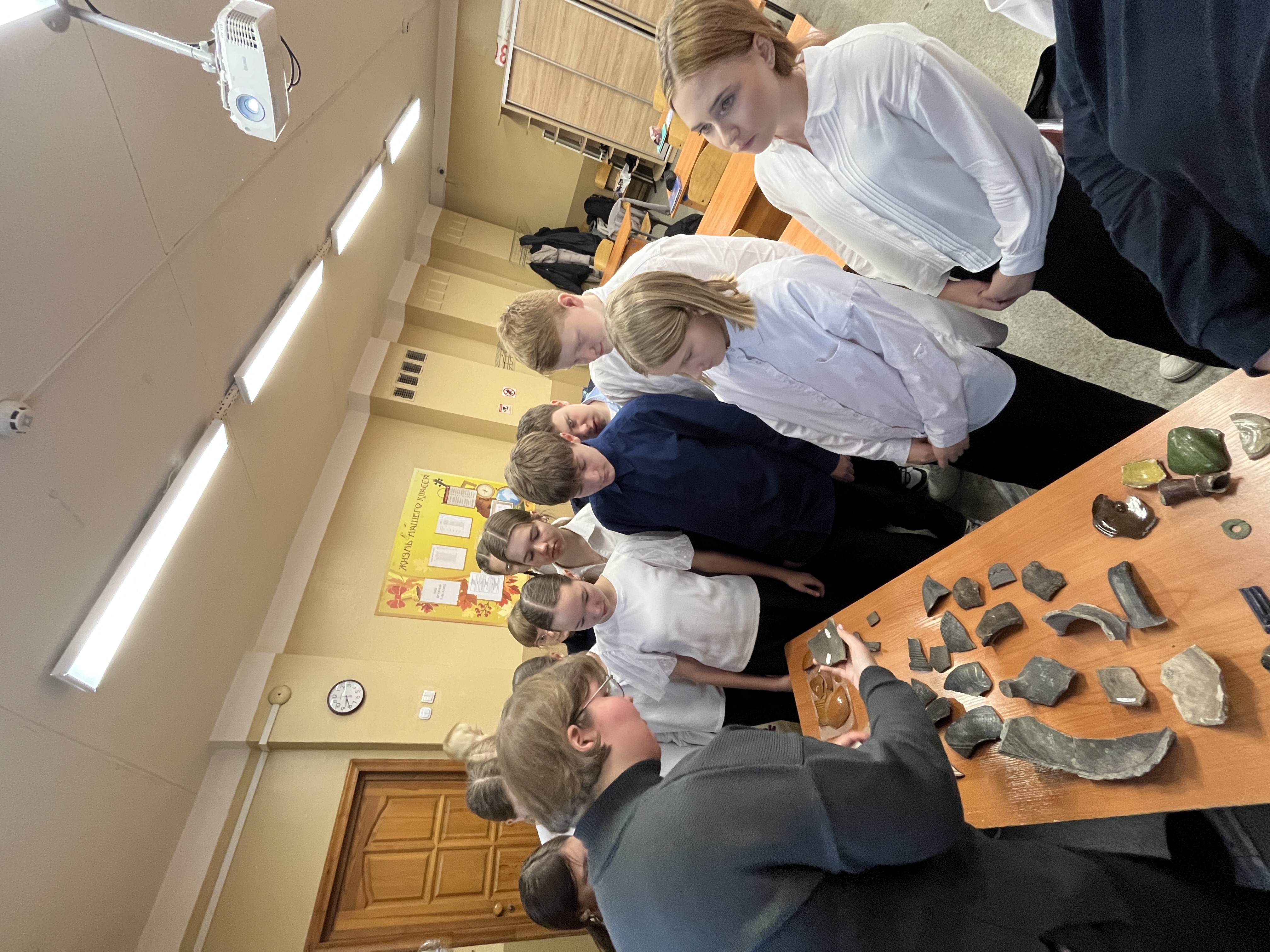 По традиции, в конце выступления волонтёры студенческого археологического отряда провели небольшую камеральную выставку, которая помогла заинтересованным ученикам седьмого класса ещё больше погрузиться в атмосферу Орловской археологии и истории. Ребята смогли не только услышать и увидеть, но и потрогать историю своего края.