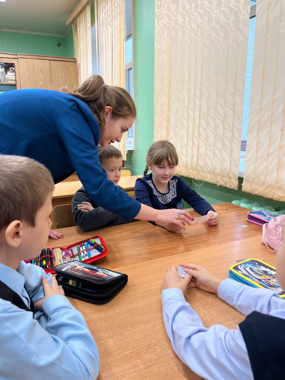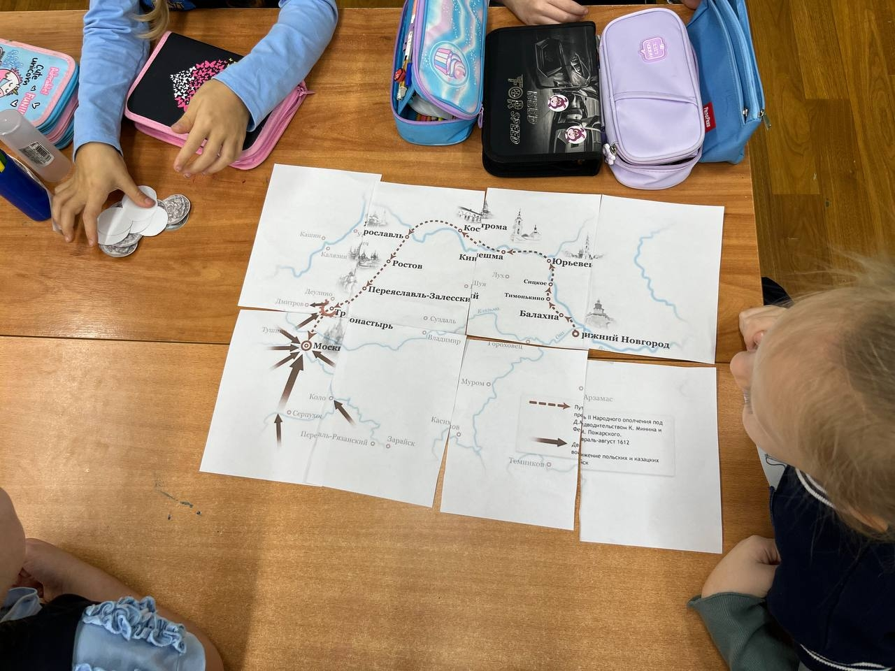 Первоклассников были поделены на три команды. За правильные ответы в конкурсах они получали монеты с изображением героев ополчения - детям очень понравился такой формат урока. Конкурсы были самыми разными – от сбора средств для ополчения (ребята отвечали на вопросы в формате викторины) до сбора карты пути второго ополчения в формате пазла.