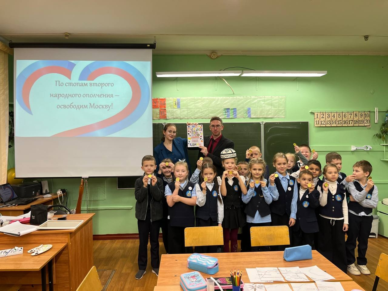 "Нам попались очень смышлёные дети. Они активно и с большим интересом участвовали во всех конкурсах" - делятся впечатлениями авторы проекта студенты Константин Алешков и Елизавета Некрасова. За 40 минут урока ребята успели узнать много фактов об истории Дня народного единства, о его героях, земском старосте Кузьме Минине и князе Дмитрии Пожарском, об их трудном пути освобождения Москвы от польских захватчиков.