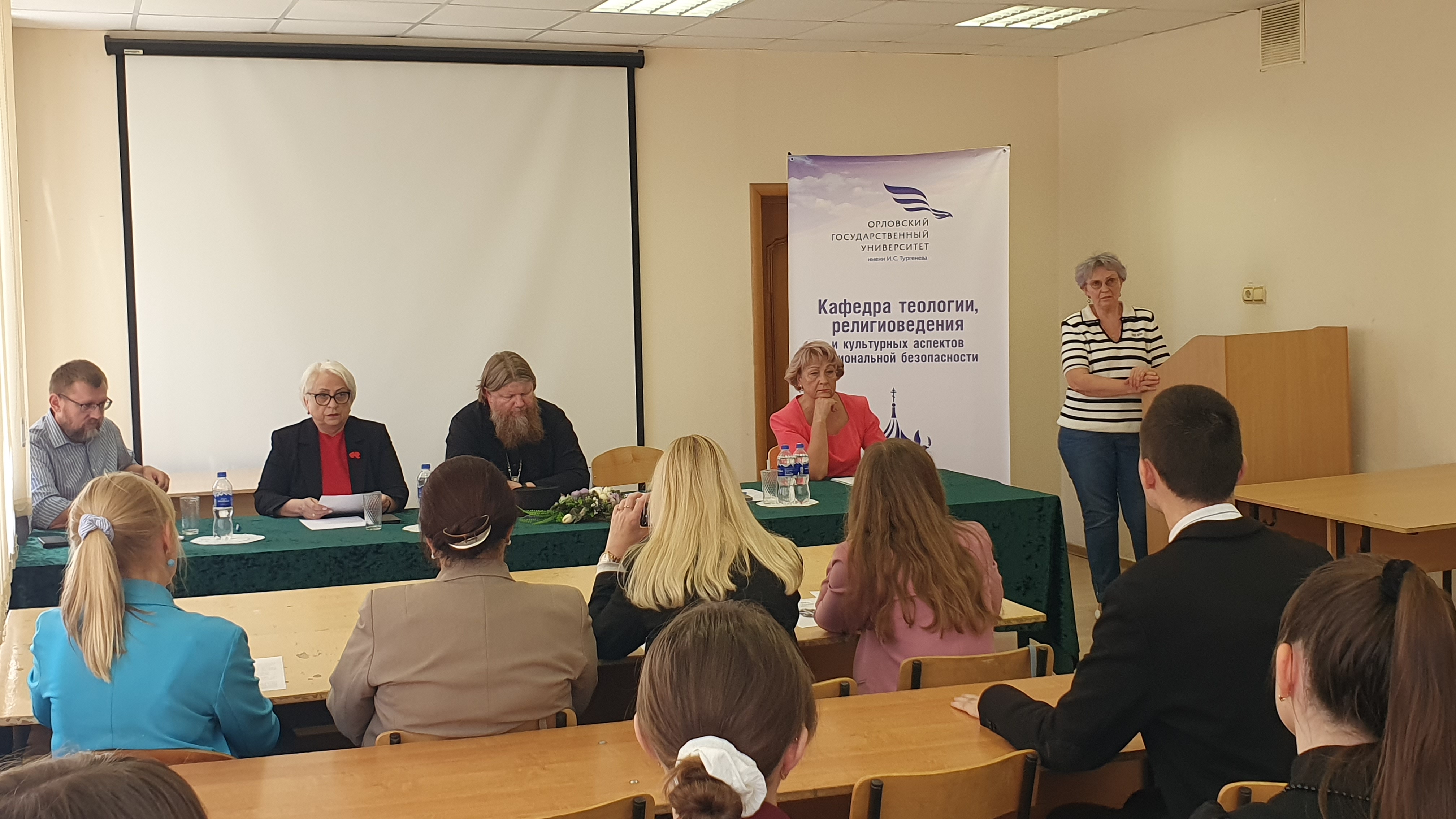 Балашова Н.П., уполномоченный по правам человека в Орловской области, на примере конкретных ситуаций показала опасность формально-законнического подхода к решению проблем людей, попавших в трудную жизненную ситуацию, подчеркнув необходимость наличия у юриста не только профессиональных знаний, но и четкой нравственной позиции. Протоиерей Николай Евдокимов, духовник Орловской православной гимназии во имя свмч. Иоанна Кукши, магистрант кафедры теологии, религиоведения и культурных аспектов национальной безопасности, в своем выступлении остановился на важности евангельских заповедей в жизни современного человека. Приведенные им библейские примеры подчеркнули вневременной характер религиозных нравственных норм и их созвучие с государственным законодательством. Человенко Т.Г., зав. кафедрой теологии, религиоведения и культурных аспектов национальной безопасности, сосредоточила внимание студентов на культурно-цивилизационных и духовно-нравственных аспектах религиозного размежевания Запада и Востока, что привело, в том числе, к различному понимаю права и его роли в жизни человека, а также на роли Указа Президента РФ 809 от 9 ноября 2022 г. «Об утверждении Основ государственной политики по сохранению и укреплению традиционных российских духовно-нравственных ценностей», направленного на актуализацию нравственного идеала России, характеризующего её как уникальное государство-цивилизацию. Петрунин В.В., доцент кафедры теологии, религиоведения и культурных аспектов национальной безопасности, остановился на правовой проблематике социальной доктрины РПЦ, показав взаимосвязь духовно-нравственного состояния человека и общества и правовой системы государства.