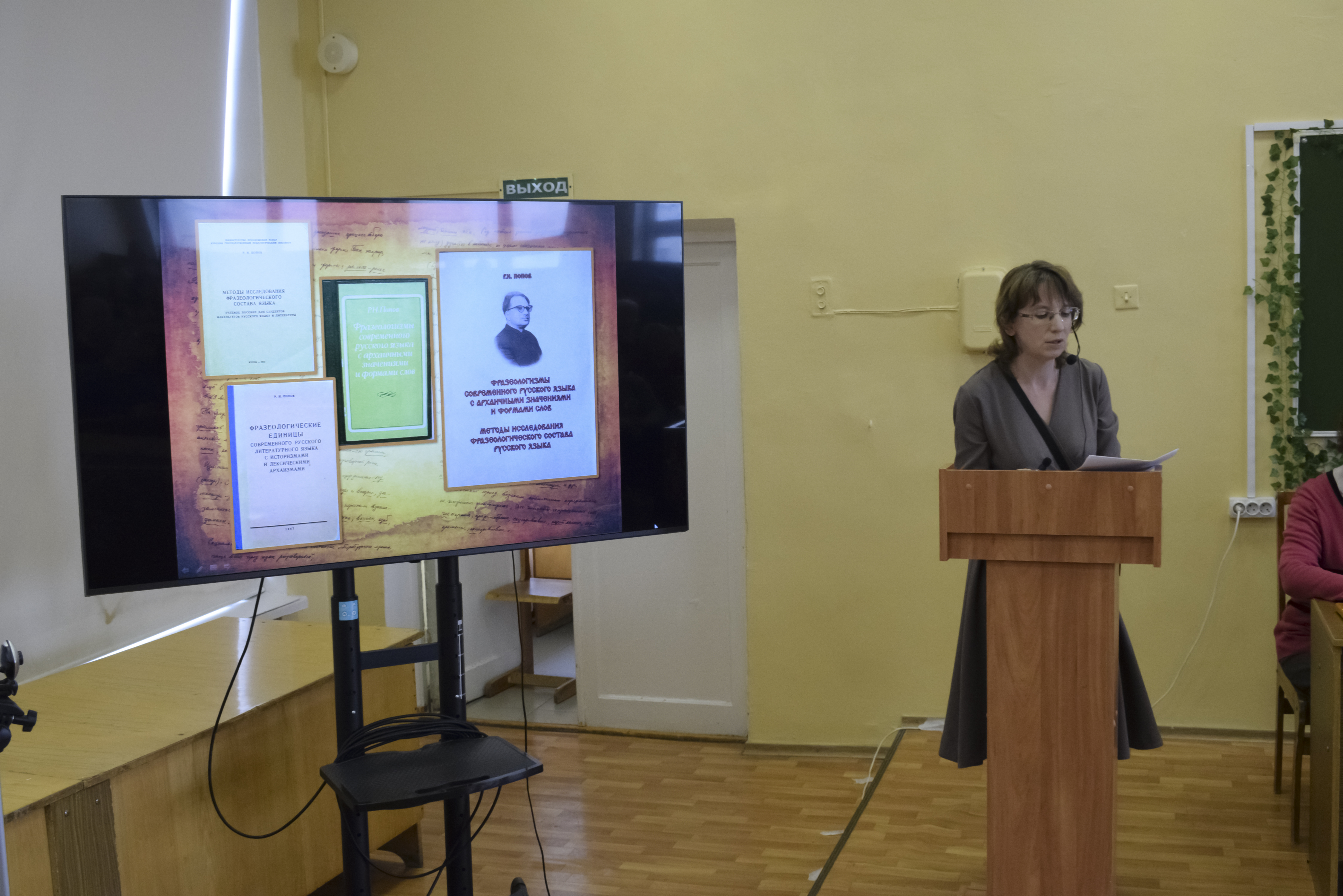 Темы докладов пленарного заседания были связаны с научной, педагогической и творческой деятельностью Ростислава Николаевича Попова. Доктор филологических наук, профессор кафедры русского языка Института филологии МГПУ, профессор кафедры славянской филологии Православного Свято-Тихвинского гуманитарного университета Огольцева Екатерина Васильевна рассказала об аспектах взаимодействия словообразования и фразеологии, подчеркнув неоценимый вклад Р.Н. Попова в эту область знаний. Отраслью развития научного творчества ученого поделилась Беднарская Лариса Дмитриевна, доктор филологических наук, профессор кафедры русского языка ОГУ им. И.С.Тургенева. С особым вниманием и трепетом аудитория встретила выступление доктора филологических наук, профессора кафедры русского языка Поповой Анны Ростиславовны, которая совместно с членами семьи продолжает научные и творческие идеи своего отца. Анна Ростиславовна представила фильм «Научное и учебно-педагогическое наследие профессора Р.Н.Попова (к 100-летию со дня рождения)», где можно было увидеть фото из личного архива и фрагменты видеолекций Ростислава Николаевича.