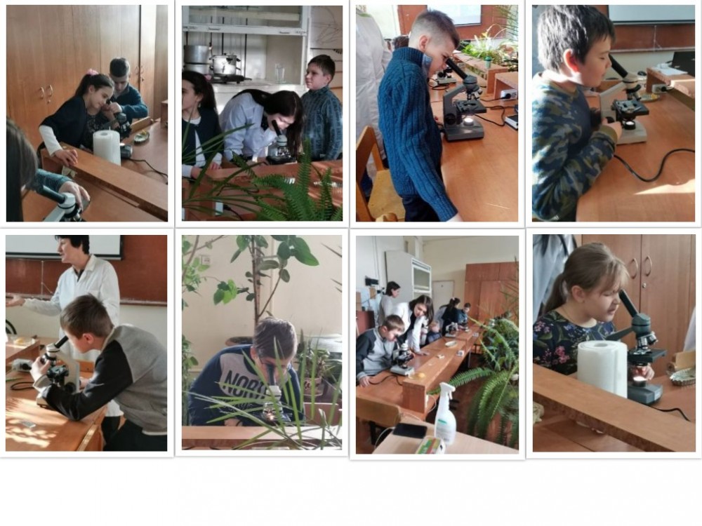 Школьники познакомились с клеточным строением животных, растений, гибов и бактерий. Ребятам были продемонстрированы и крупные клетки, которые видны без микроскопа (куриное яйцо, дольки апельсина) и микроскопические клетки (бактерии). Кроме того, гости практического семинара смогли сравнить структуру многоклеточных (пресноводная гидра, кровь человека, стебель клевера, водоросль кладофора) и одноклеточные организмов (инфузории, диатомовые и одноклеточные зеленые водоросли).