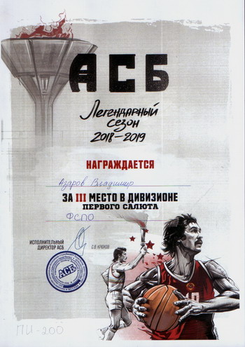 Юноши в составе Владимира Азарова, Артема Воскресенского, Даниила Милютина, Дмитрия Миронова, Дмитрия Мишечкина и Даниила Устинова заняли почетное третье место в Дивизионе первого салюта Ассоциации студенческого баскетбола.
