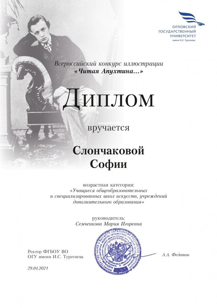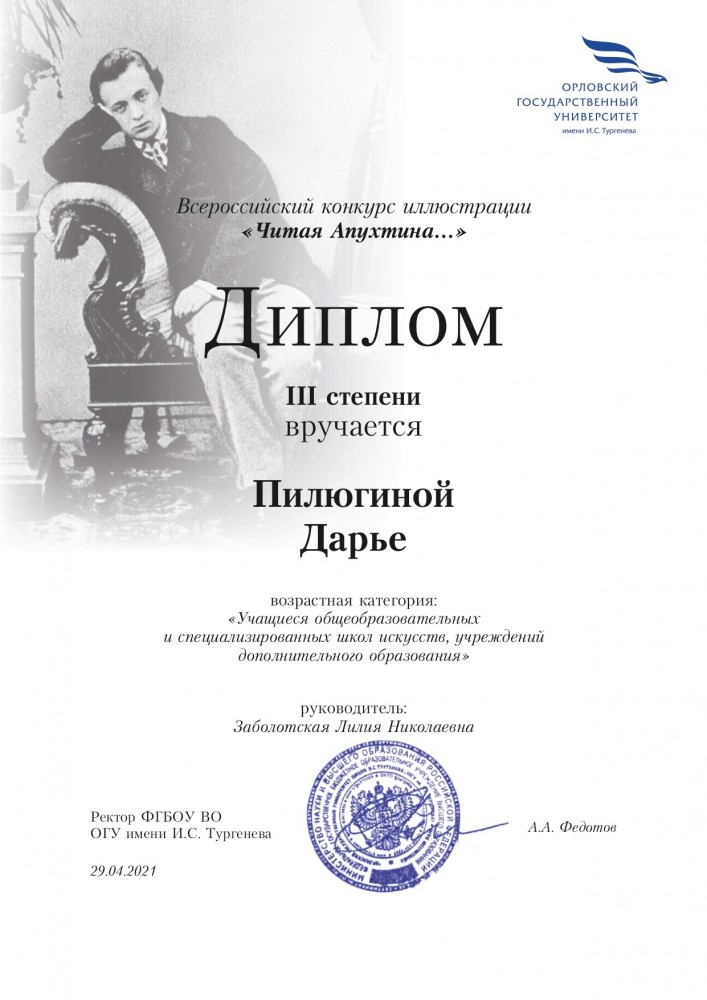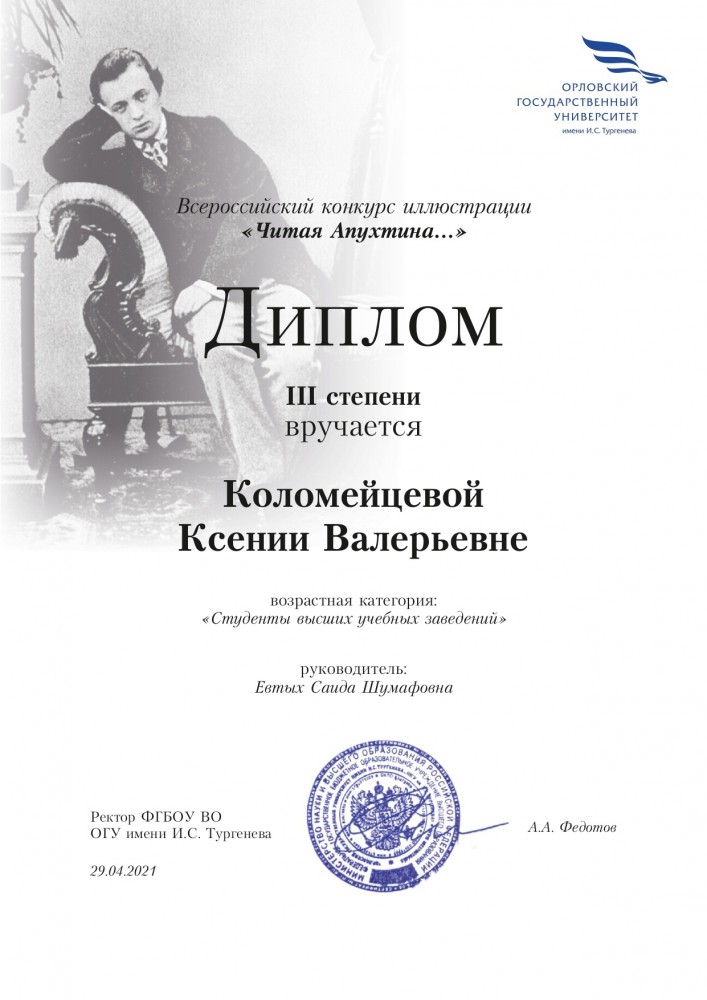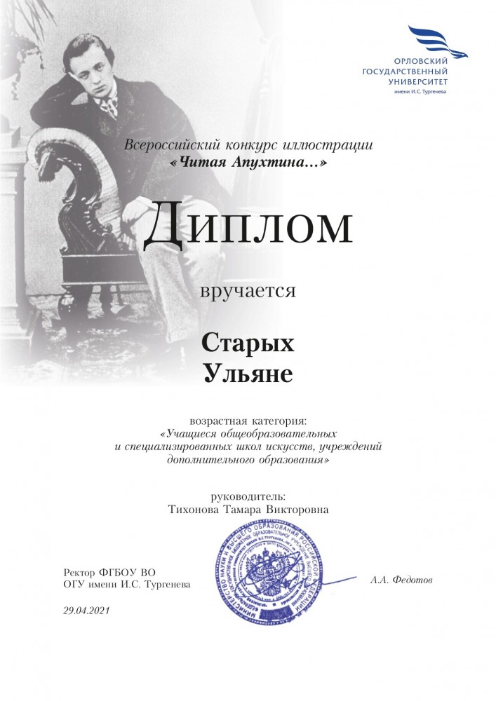 В марте 2021 года кафедрой рисунка ОГУ имени И.С. Тургенева при поддержке Полиграфической фирмы «Картуш», Орловского объединенного государственного литературного музея И.С. Тургенева, Орловской региональной организации ВТОО «Союз художников России» и Общероссийской общественной организации «Ассоциация искусствоведов» был организован Всероссийский конкурс иллюстрации «Читая Апухтина…». Планируя мероприятие, организаторы ставили целью привлечение внимания начинающих и молодых художников, а также широкой общественности к отображению русской литературы в современном искусстве. Принять участие в конкурсе приглашались учащиеся школ и студенты специализированных учебных заведений. Для проведения мероприятия был избран дистанционный формат. Участники соревновались в номинации «Графика». Несмотря на это ограничение, конкурсанты были в праве предоставить любое количество работ и самостоятельно выбирать художественные средства, необходимые для создания изображения, будь то уникальная, печатная или компьютерная графика. Также, изображения могли быть выполнены как монохромно, так и в цвете.