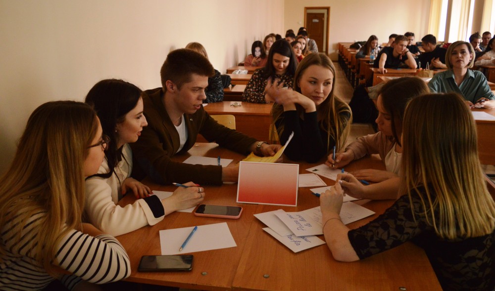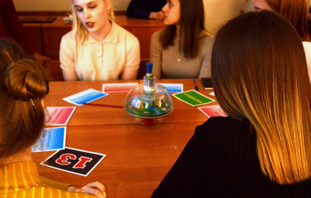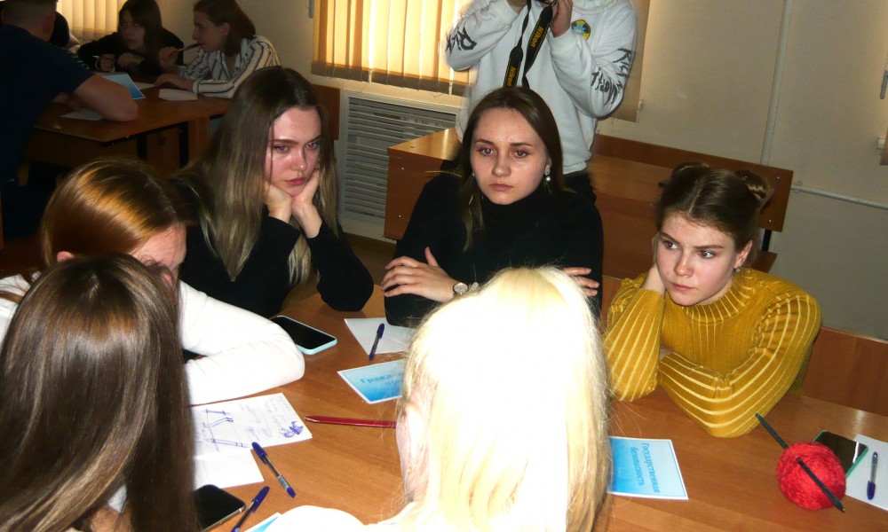 За синим игровым столом вне конкурса, но с обязательным подсчетом количества правильных ответов посредством карточек, сыграла команда 1-го курса специальности Правовое обеспечение национальной безопасности группы 01НБ в следующем составе: