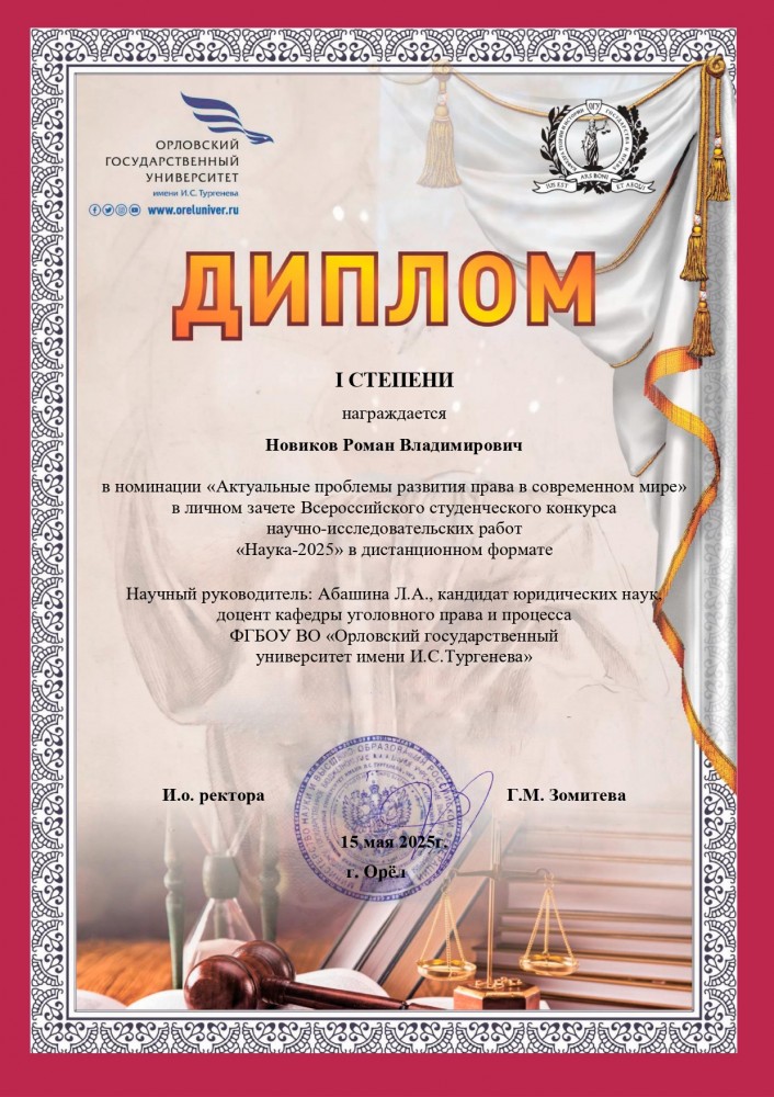 Поздравляем Новикова Романа Владимировича, студента 4 курса направления подготовки: 40.03.01 Юриспруденция с получением диплома I степени за участие во Всероссийском студенческом конкурсе научно-исследовательских работ "Наука-2025" в номинации "Актуальные проблемы развития права в современном мире"! Также поздравляем Юричева Руслана Ивановича, студента 4 курса направления подготовки: 40.03.01 Юриспруденция с получением диплома 2 степени в той же номинации!