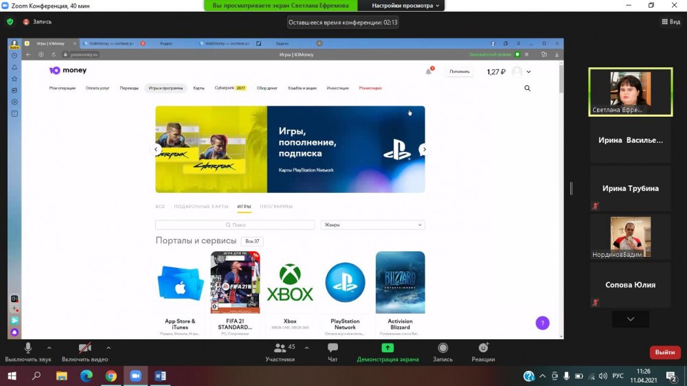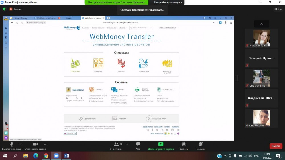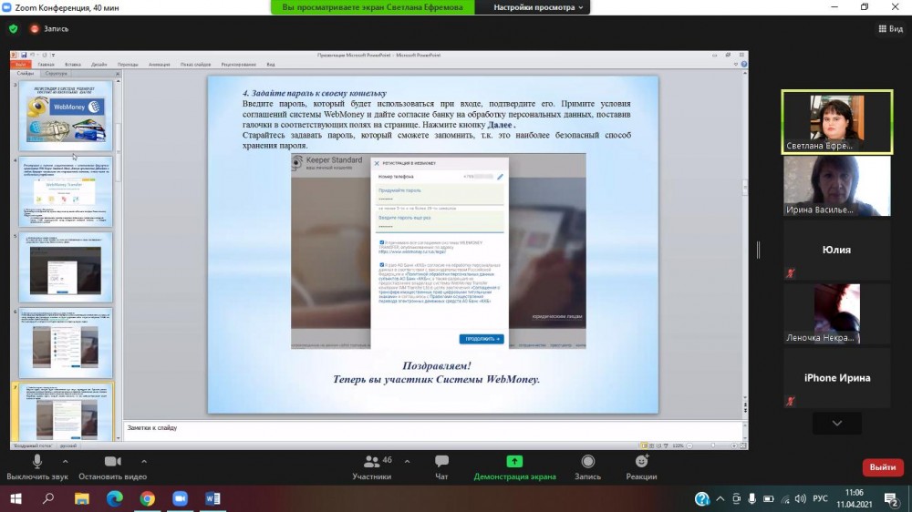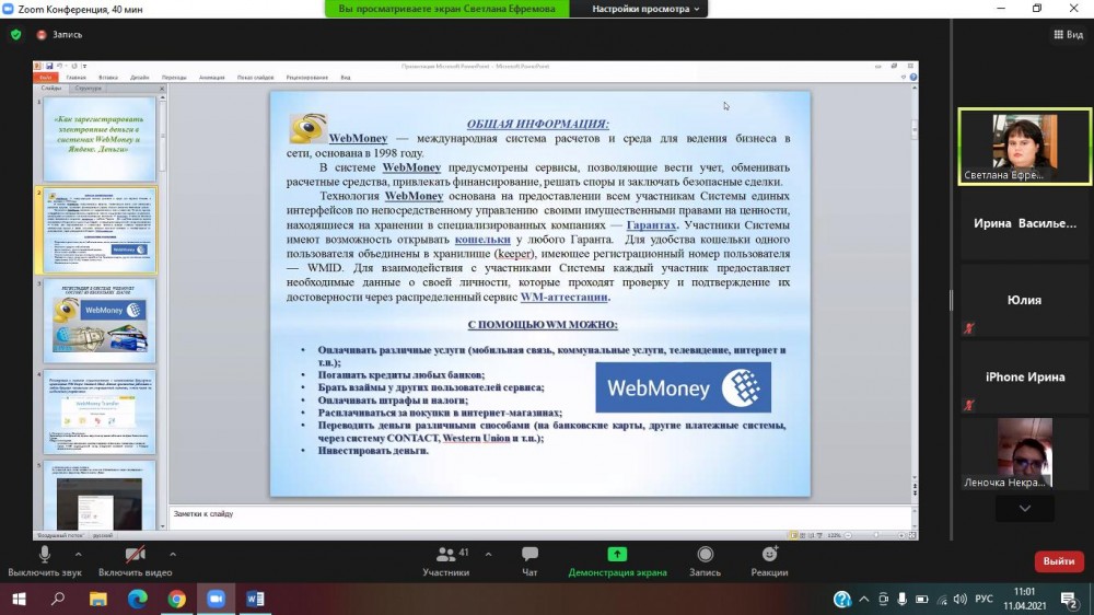 11 апреля 2021 г в рамках Цифровой недели финансовой грамотности в Орловской области на базе Института экономики и управления ФГБОУ ВО «Орловский государственный университет имени И.С. Тургенева» для студентов экономических направлений подготовки заочной формы был проведен мастер класс на тему «Как зарегистрировать электронные деньги в системах Web Money и Яндекс.Деньги».