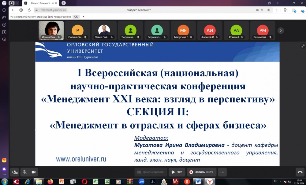 В рамках I 1 Всероссийской (национальная) научно-практическая конференции «Менеджмент XXI века: взгляд в перспективу», 12.04.2024 г. состоялось заседание Секции II «Менеджмент в отраслях и сферах бизнеса». Модератором секции выступила доцент кафедры менеджмента и государственного управления, к.э.н., доцент Мусатова И.В.