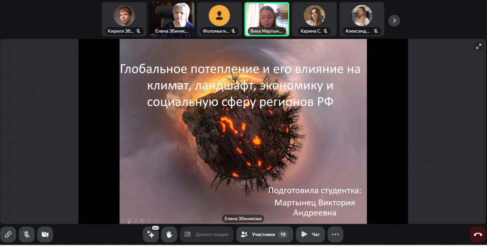 22.04.2025г. в рамках I Всероссийской научно-практической конференции «Управление устойчивым развитием: инновации и адаптационные механизмы в условиях изменения климата в регионе» состоялась заседание Секции «Социальные решения климатических проблем». Модератором секции выступила кандидат экономических наук, доцент Збинякова Елена Анатольевна.