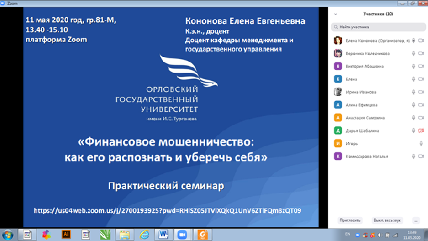 11.05.2020 года доцентом кафедры менеджмента и государственного управления Кононовой Е.Е. проведен практический семинар, в рамках мероприятий института экономики и управления «Марафон финансовой грамотности»