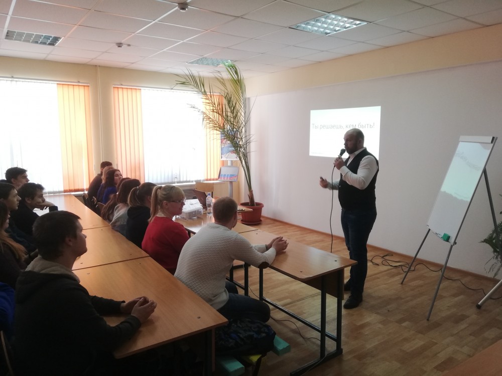 Артем Алексеевич за два дня провел со студентами филиала 4 тренинг семинара по следующим темам: "Работа и работодатели. Кто твой работодатель", "Ключевые игроки рынка труда для студентов конкретного факультета", "Резюме как VIP-пропуск на собеседование. Основные правила написания идеального резюме", "Собеседование. Правила поведения на собеседовании".
