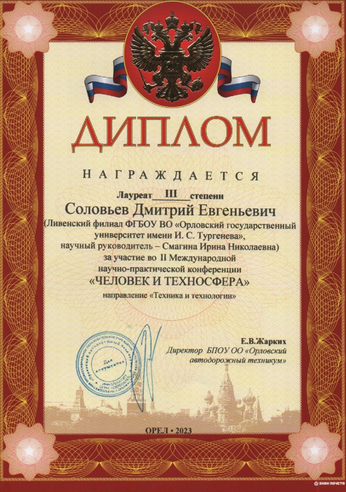 Поздравляем студентов филиала с успешным участием во II Международной научно-практической конференции «Человек и техносфера» (26 апреля 2023г.). Организатором конференции выступил БПОУ ОО «Орловский автодорожный техникум», г. Орёл.