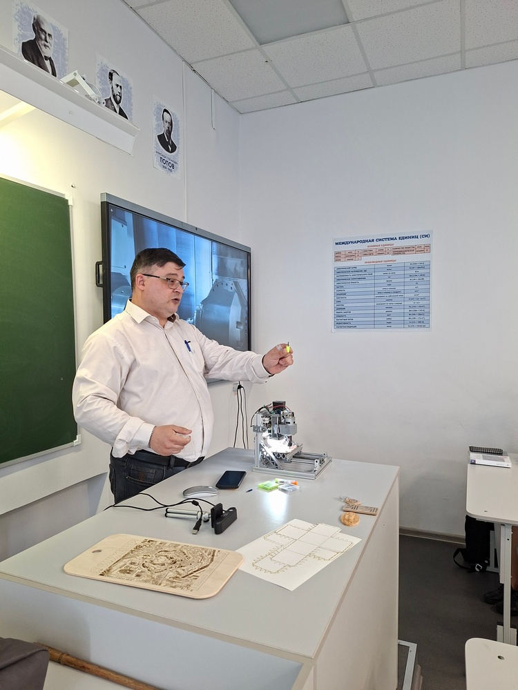 Так 17 февраля и 16 апреля 2026г. доценты кафедры инженерного образования Тупикин Д.А. и Звягина Е.А. провели мастер-классы с учащимися школ №2 и №5 г. Ливны. В ходе мероприятий школьникам была предоставлена информация по внедрению искусственного интеллекта в машиностроении, автоматизации и роботизации производственных процессов, продемонстрированы возможности лазерной резки и обработки на станке с ЧПУ.