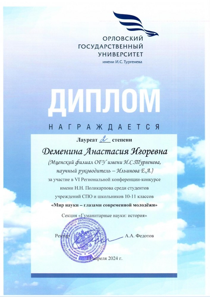 11.04.2024 года на базе Политехнического института им. Н.Н.Поликарпова ФГБОУ ВО «Орловский государственный университет имени И.С.Тургенева» прошла VI региональная конференция-конкурс имени Н.Н.Поликарпова среди студентов учреждений СПО и школьников 10-11 классов. Обучающиеся Мценского филиала под руководством преподавателя кафедры ООД Ильиновой Е.А. приняли участие в работе секции «Гуманитарные науки: истори». Обучающиеся гр. Зм-1-395 Горлова Елизавета и Деменина Анастасия представили исследовательскую работу по теме: «Военная хитрость советских военачальников при проведении боевых операций в ВОВ» и заняли 2 место. Обучающаяся гр. Гд-2-387 Шахова Мария защитила исследовательскую статью по теме: «Эволюция российского самосознания после революции 1905-1907года» и заняла 3 место. Научный