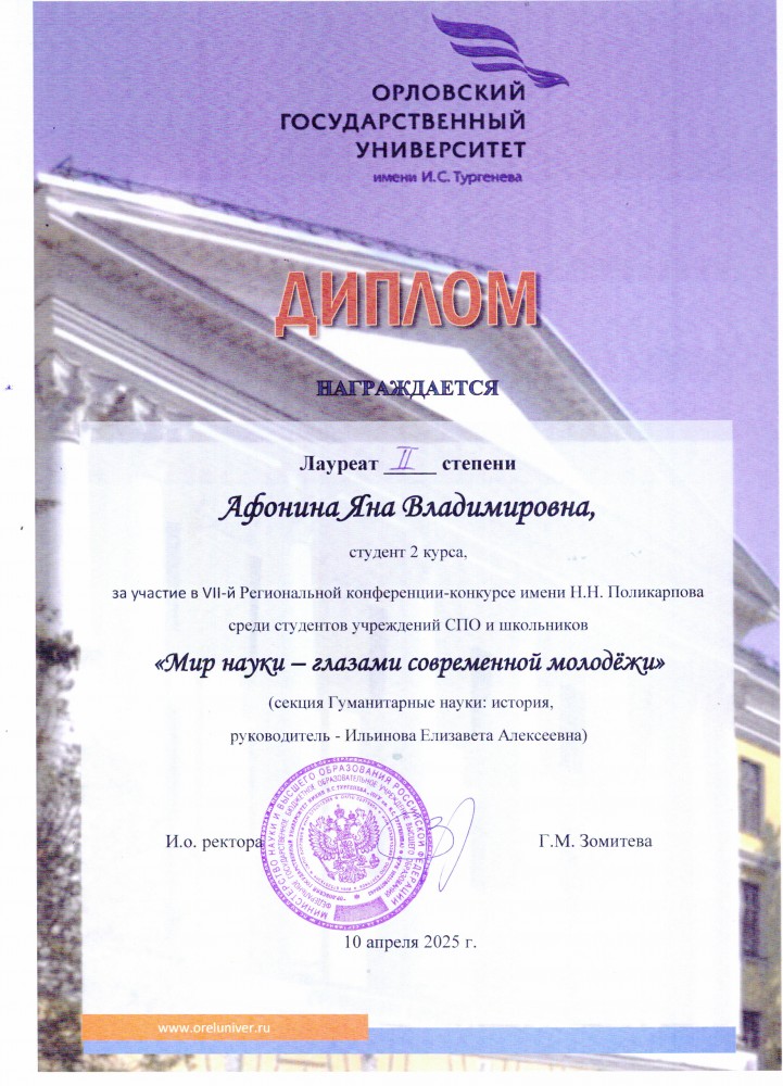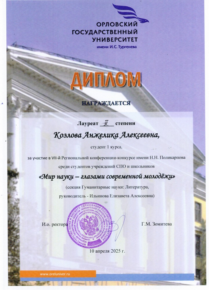 Обучающиеся 1 курса Мценского филиала гр. Са-1-398 Козлова Анжелика и Сидорин Сергей приняли участие в секции «Гуманитарные науки: литература» с докладом по теме «Взгляд на Россию через взаимоотношения И.С. Тургенева и Л.Н. Толстого» и получили диплом II степени. Обучающаяся 2 курса гр.Са-2-390 Афонина Яна участвовала в секции «Гуманитарные науки: история» и представила исследовательскую работу на тему: «Кодекс чести» гвардейских офицеров императорской гвардии и росгвардейцев современной России» и также получила диплом II степени. Научный руководитель обучающихся – преподаватель кафедры общеобразовательных дисциплин Ильинова Е.А.
