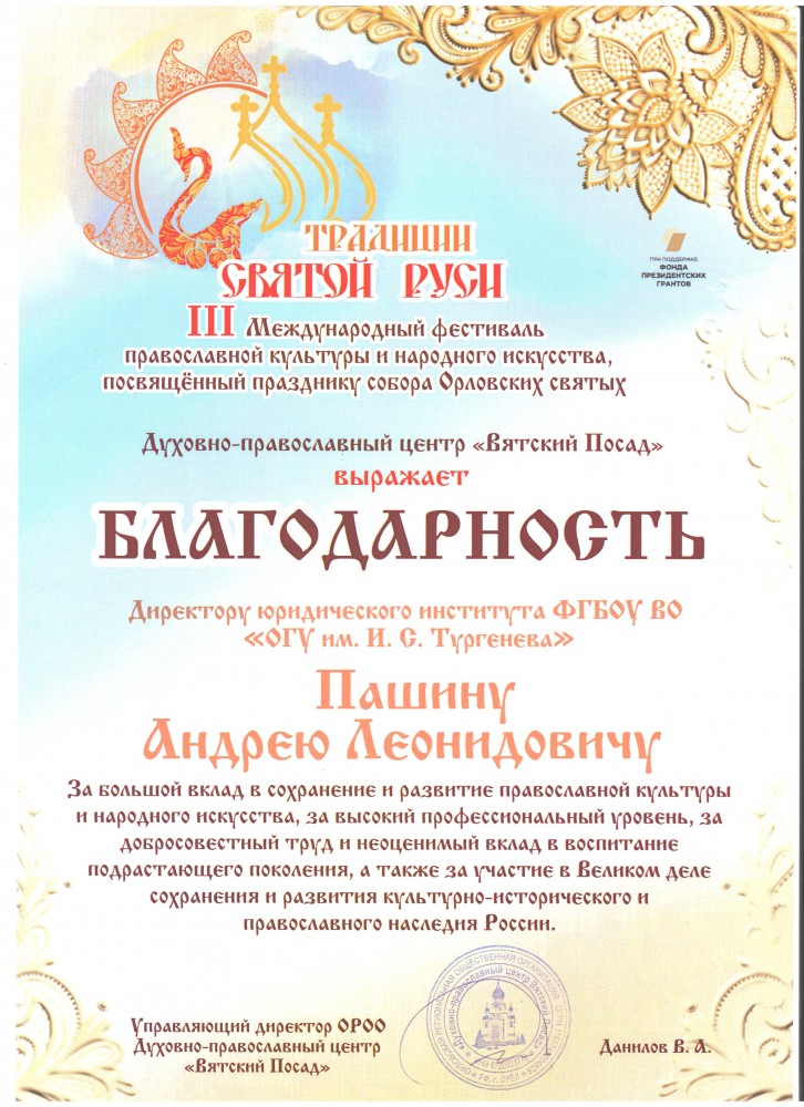 Духовно-православный центр «Вятский Посад» выражает Благодарность директору юридического института Пашину Андрею Леонидовичу за большой вклад в сохранение и развитие православной культуры и народного искусства, за высокий профессиональный уровень, за добросовестный труд и неоценимый вклад в воспитание подрастающего поколения, а также за участие в Великом деле сохранения и развития культурно-исторического и православного наследия России
