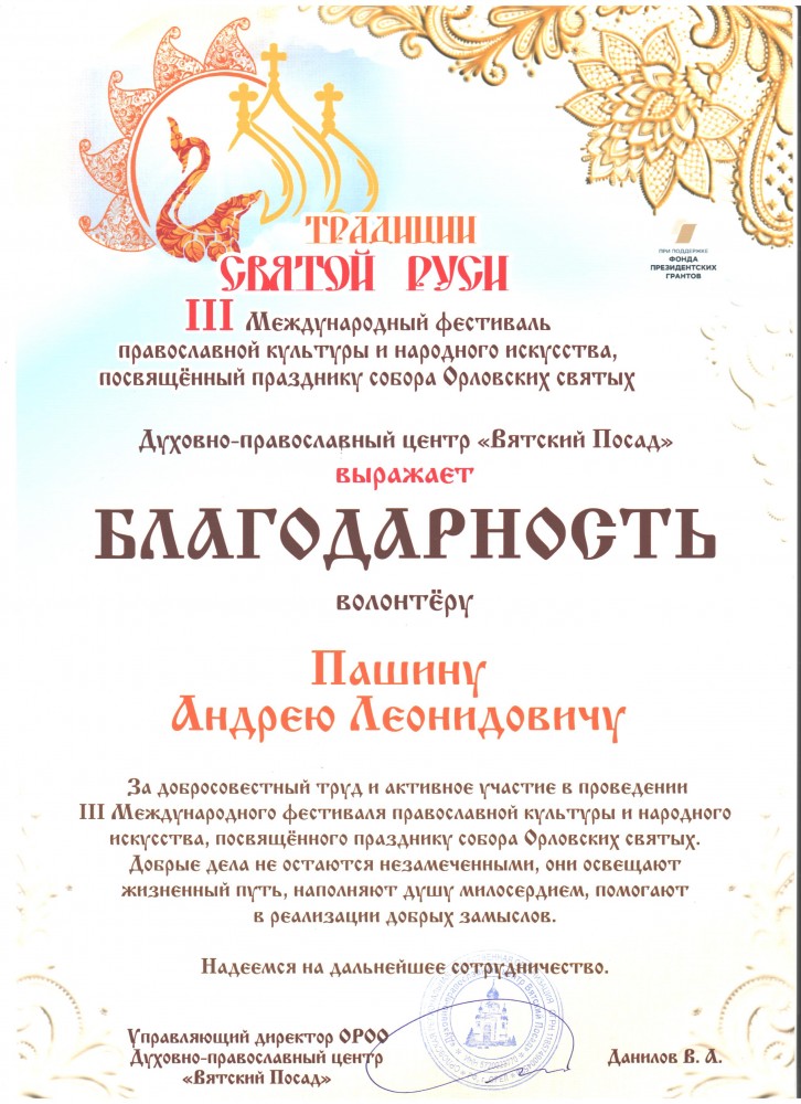 Духовно-православный центр «Вятский Посад» выражает Благодарность волонтеру Пашину Андрею Леонидовичу за добросовестный труд и активное участие в проведении III Международного фестиваля православной культуры и народного искусства, посвященного празднику собора Орловских святых
