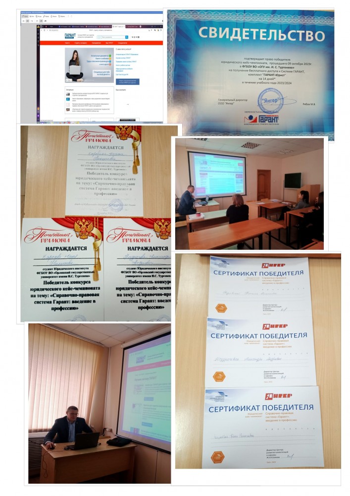 В рамках университетского проекта «Марафон карьеры-3» в целях реализации активной политики содействия трудоустройству молодежи, помощи в карьерной ориентации, а также формирования карьерных компетенций у студентов Юридического института Орловского государственного университета имени И.С. Тургенева, состоялся Юридический кейс-чемпионат «Справочно-правовая система Гарант. Введение в профессию», в рамках которого студенты получили навыки работы со справочно-правовой системой Гарант, а также провели соревнование, демонстрирующее умение работать в системе.