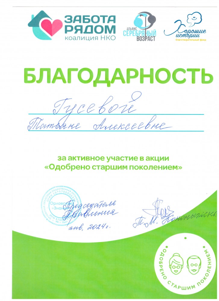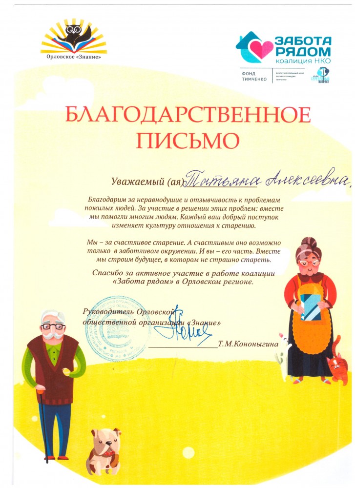 За цикл лекций о правах людей СТАРШЕГО поколения профессору кафедры КАиФП Гусевой Т.А. от Орловского филиала коалиции НКО «Забота рядом» объявлена благодарность и вручено благодарственное письмо от Орловской общественной организации «Знание»