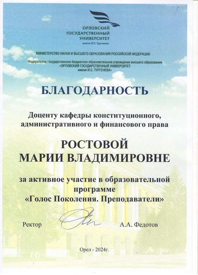 За активное участие в образовательной программе «Голос поколения. Преподаватели» Ростова М.В. награждена Благодарностью ректора университета Федотова А.А.