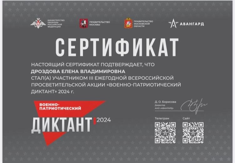 18 ноября 2024 г. старший преподаватель кафедры Дроздова Елена Владимировна приняла участие в III Ежегодной всероссийской просветительской акции «Военно-патриотический диктант-2024», организованным и проводимым Учебно-методическим центром военно-патриотического воспитания «Авангард» при поддержке Российского общества «Знание» и Министерства обороны РФ.