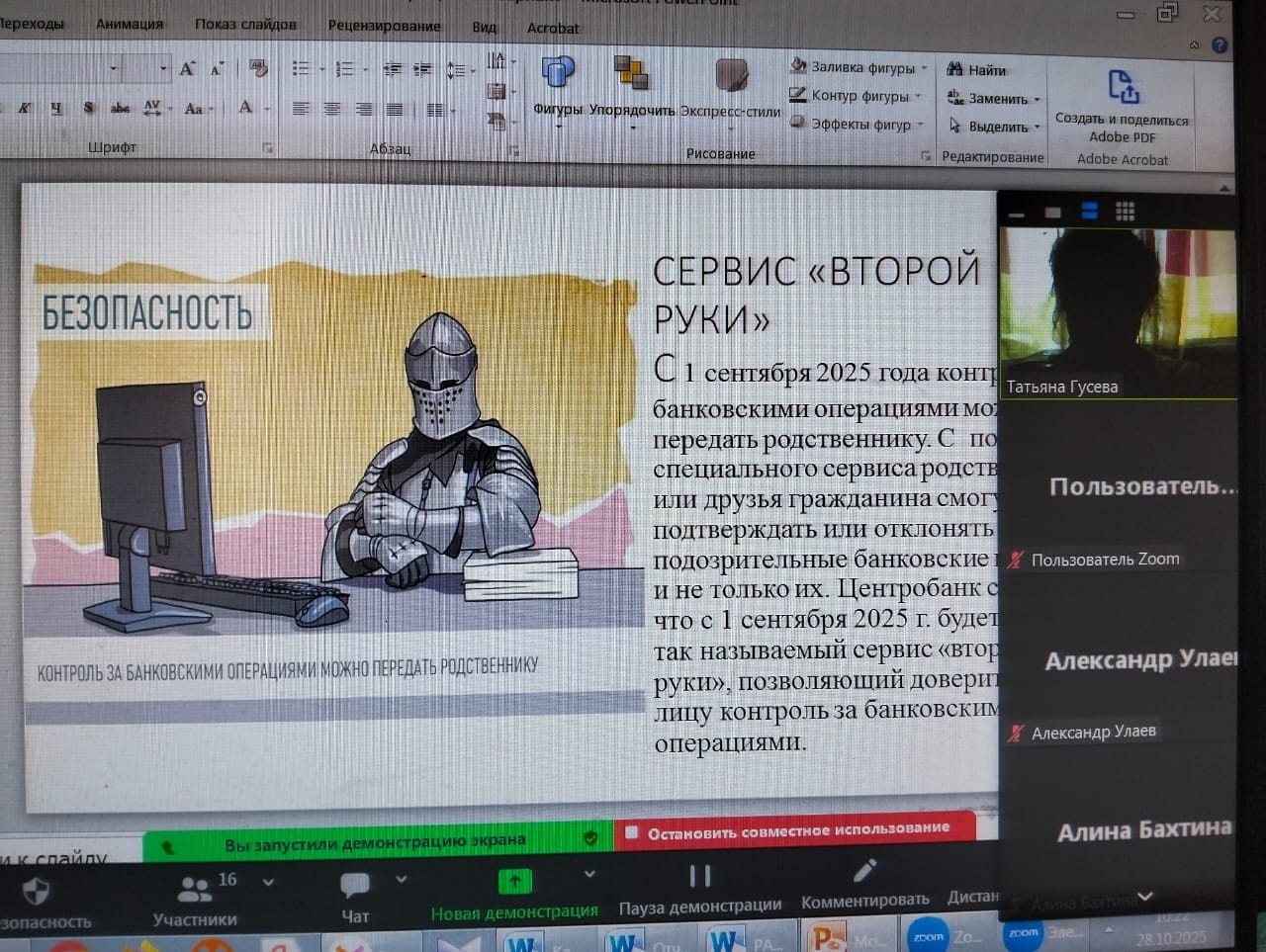 28 октября 2025 года состоялась онлайн встреча с профессором кафедры конституционного, административного и финансового права Юридического института Гусевой Т.А. в рамках Всероссийского Фестиваля науки «НАУКА 0+ 2025», предметом которой стал разговор о противодействии мошенническим схемам.