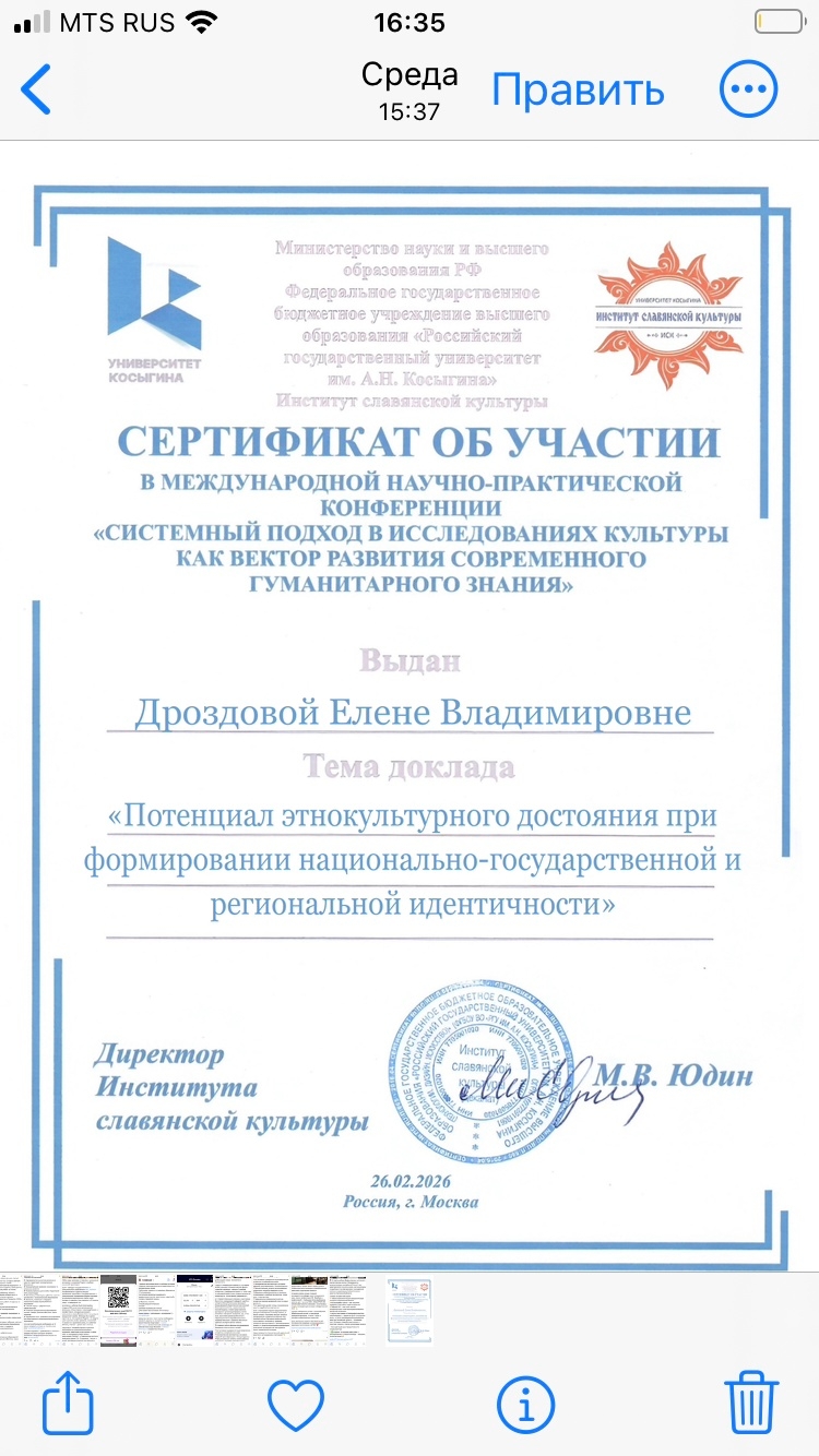 Дроздова Е.В., как наставник Студенческого Научного Общества «CIVIS. Проблемы гражданской и государственно-национальной идентичности» приняла участие в Международной научно-практической конференции «Системный подход в исследованиях культуры как вектор развития современного гуманитарного знания», проведенной на площадке Института славянской культуры Российского государственного университета имени А.Н. Косыгина. Тема доклада: «Потенциал этнокультурного достояния при формировании государственно-национальной и региональной идентичности».
