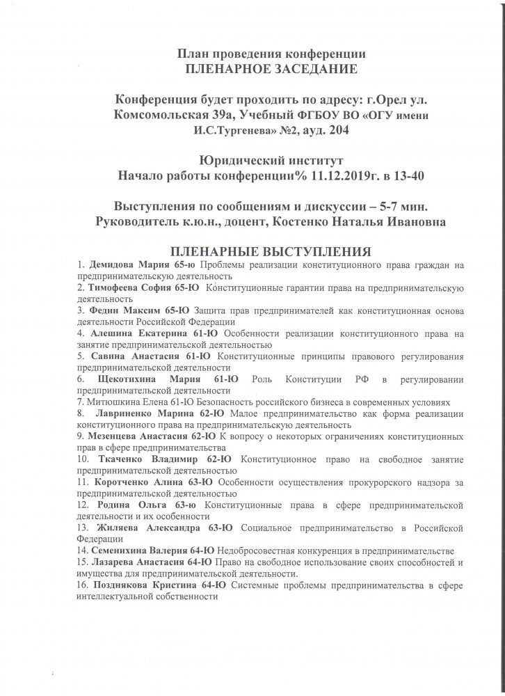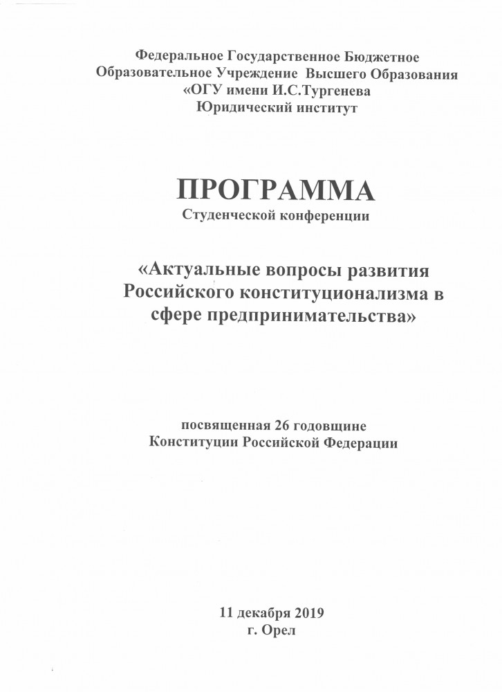 11 декабря 2019 г. под руководством к.ю.н., доцента Костенко Н.И. проведена Студенческая конференция "Актуальные вопросы развития российского конституционализма в сфере предпринимательства", посвященная 26 годовщине Конституции Российской Федерации.