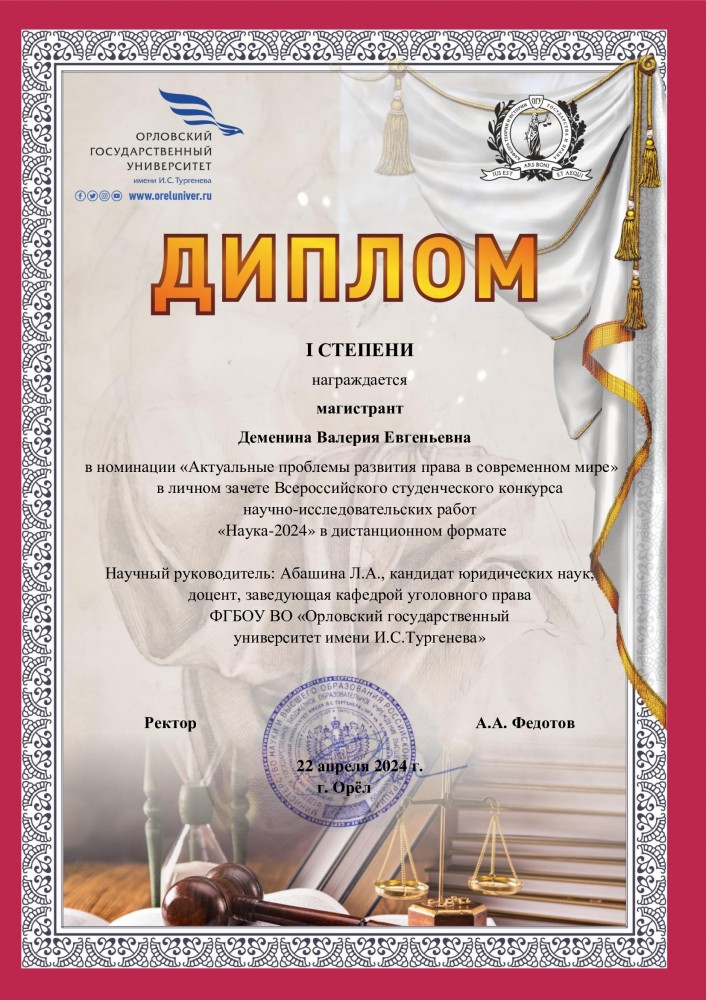 Подведены итоги Всероссийского студенческого конкурса научно-исследовательских работ "Наука-2024", проходившего с 20 марта по 8 апреля 2024 г. Деменина Валерия Евгеньевна – стала победителем конкурса в номинации «Актуальные проблемы развития права в современном мире» (тема исследования – «Запрет пыток в условиях борьбы с терроризмом», научный руководитель: к.ю.н., доцент, зав.кафедрой уголовного права Абашина Людмила Александровна).