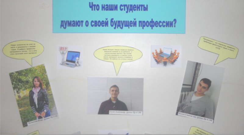 Студентами групп Пр-2-314, Пр-3-306, Пр-4-298, Кс-2-315 был оформлен стенд на тему: "Что наши студенты думают о своей будущей профессии" |