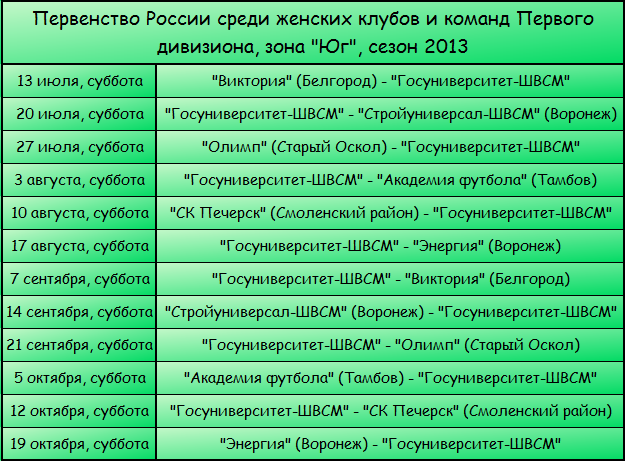 28 апреля 2013 "Госуниверситет-ШВСМ" (Орел) - "Калужаночка" (Калуга) 2:1 Голы: Наймушина, Шандрак К. Предупреждение: Аверина
