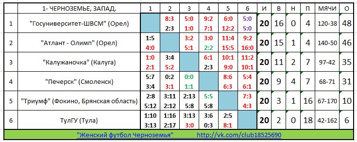 В январе взяла старт Первая лига Чемпионата России по мини-футболу среди женских команд. Уже на протяжении 5 лет в этих соревнованиях выступает орловская команда «Госуниверситет-ШВСМ», а второй год подряд наш город представляет еще один коллектив – «ОрелГАУ-Атлант». Как и в прошлом сезоне, все команды участвующие в Чемпионате в зоне «Черноземье» разбиты на две подгруппы – «восток» и «запад». Оба орловских коллектива выступают в зоне «запад», где конкуренцию им составляют две команды из Смоленска – «Печерск» и «СГАФКСиТ», а также прошлогодний победитель общероссийского финала Первой лиги – «Калужаночка» (Калуга).
