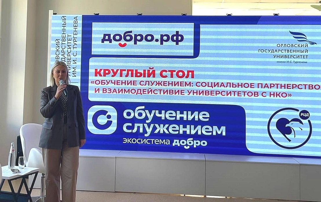 - директор ресурсного центра добровольчества Елена Баженова с докладом о реализации федеральной программы «Обучение служением» в Орловской области, результатах и перспективах взаимодействия университетов с социально ориентированными и некоммерческими организациями,