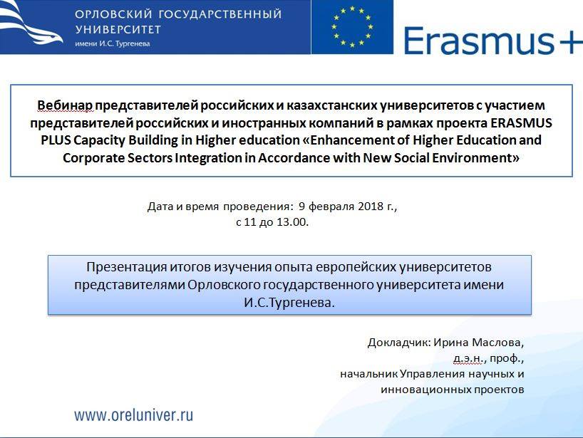 09.02.2018 г. участники рабочей группы ОГУ имени И.С. Тургенева приняли участие в вебинаре представителей российских и казахстанских университетов с участием представителей российских и иностранных компаний в рамках проекта ERASMUS PLUS Capacity Building in Higher education «Enhancement of Higher Education and Corporate Sectors Integration in Accordance with New Social Environment».
