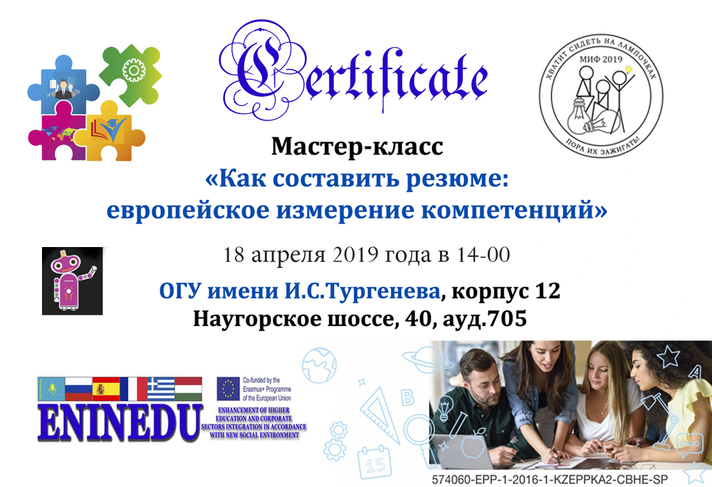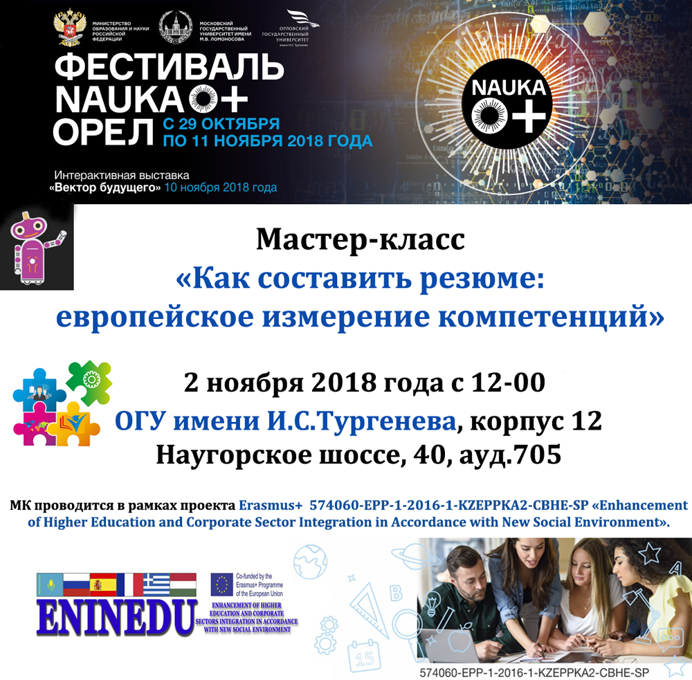 18.04.2019 г. в рамках Недели науки-2019 на базе Центра экономики и бизнеса ОГУ имени И.С.Тургенева, созданного по проекту ENINEDU, прошел Мастер-класс для школьников и студентов "Как составить резюме: европейское измерение компетенций". Очень хорошо поговорили о профессиональных траекториях, о профессиональном кругозоре, о возможностях и аспектах верификации информации в интернете, о плюсах и ограничениях современных информационных систем и сервисов по трудоустройству.