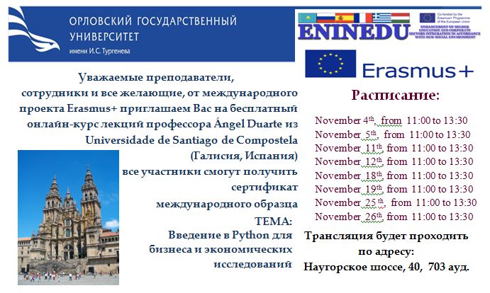 В период c 14.06.2018 г. по 22.06.2018 г. июня в рамках проекта ENINEDU состоялась рабочая поездка в Университет Сантьяго-де-Компостела - USC, в которой приняли участие сотрудники Орловского государственного университета д.э.н.,проф. Полиди А.А. и д.э.н.,проф. Попова Л.В.