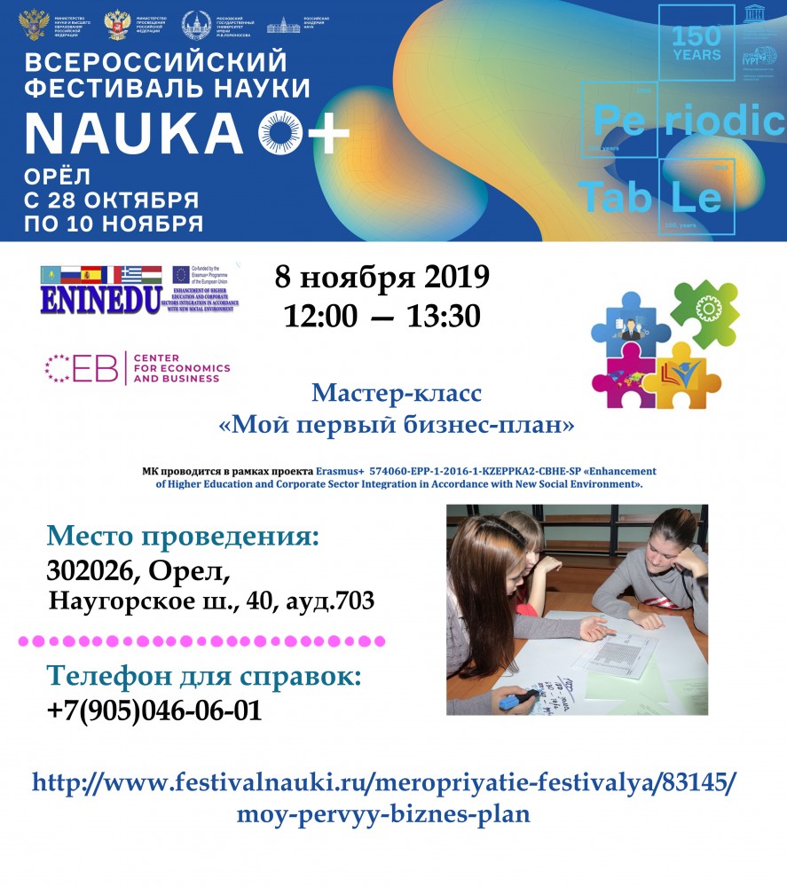 8 ноября 2019 года в рамках Фестиваля науки NAUKA 0+ прошел МК для школьников на тему "Мой первый бизнес-план", организованный командой проекта ENINEDU на базе Центра экономики и бизнеса